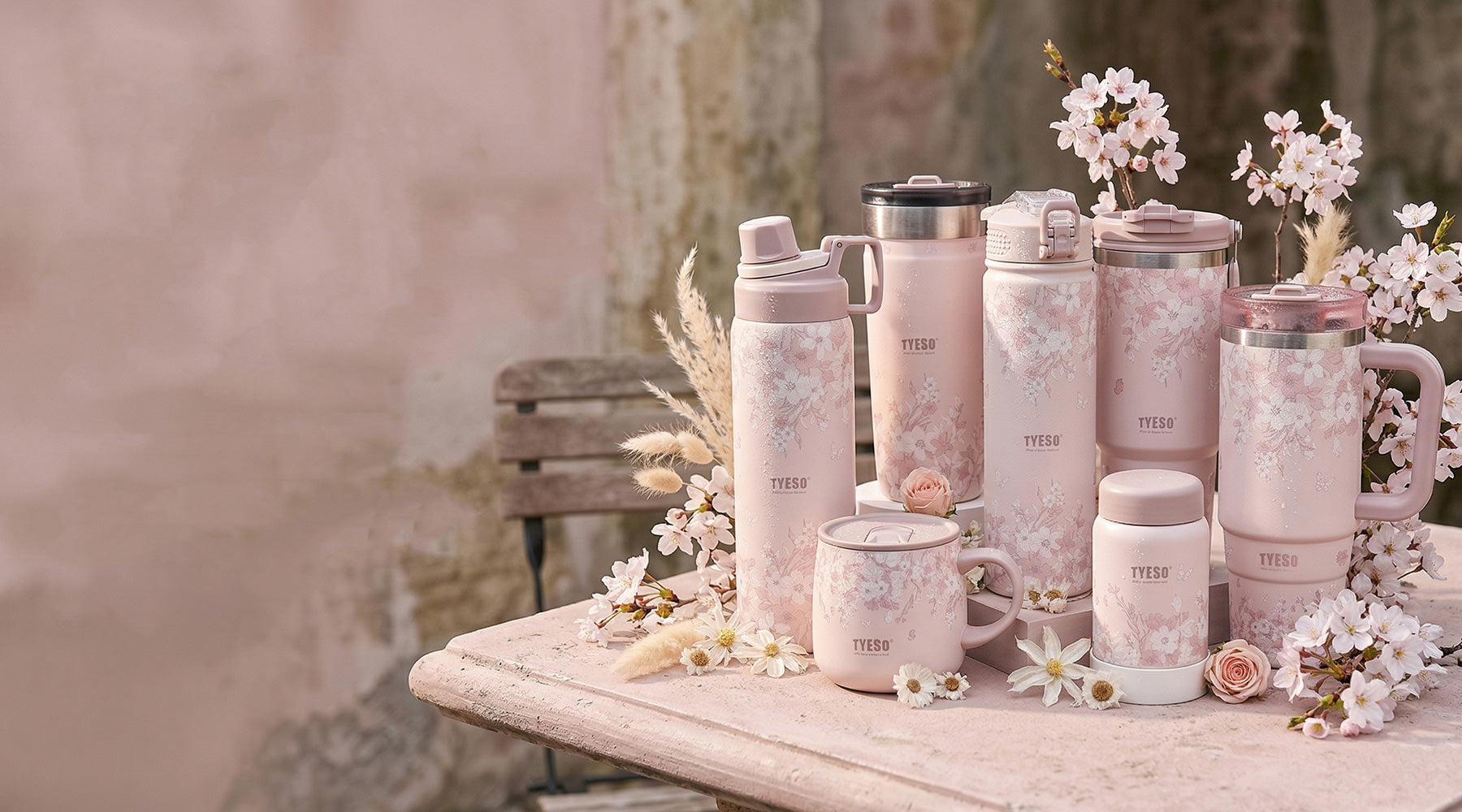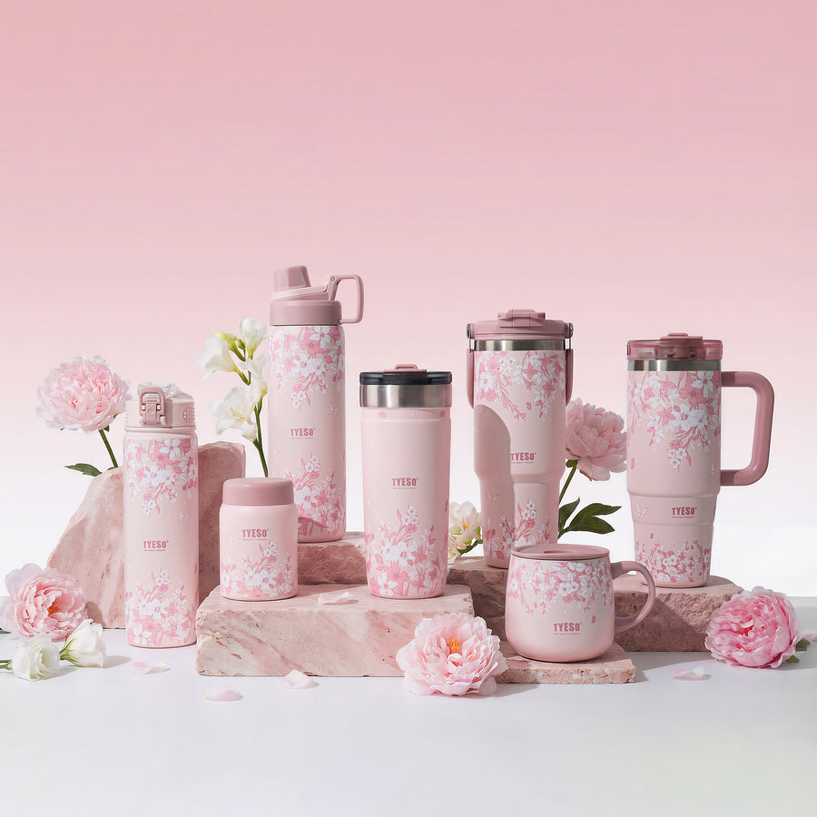 Romantic pink tones paired with delicate floral detailing across tumblers, bottles, mugs, and more.