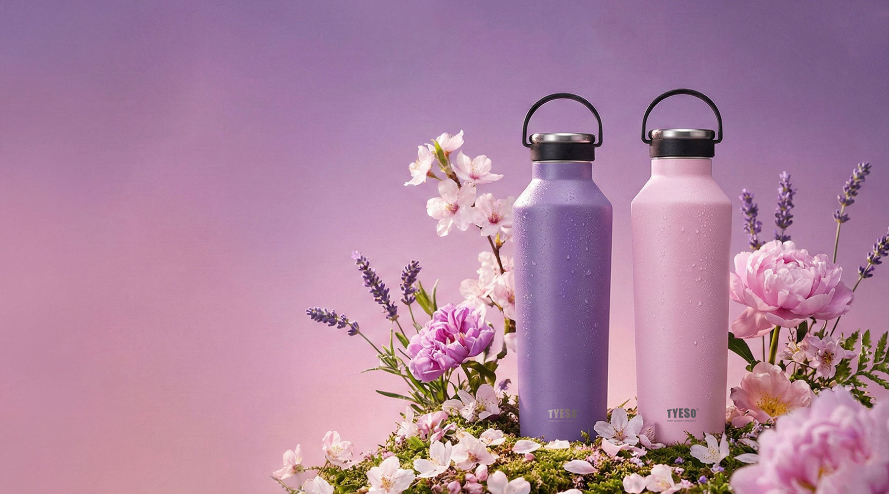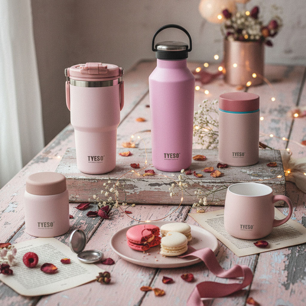 Romantic pink tones paired with delicate floral detailing across tumblers, bottles, mugs, and more.
